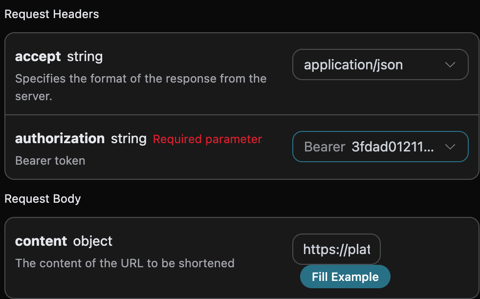 首先先了解下基本的使用方式,就是输入需要转换的较长URL,便可获得处理后的结果,首先需要简单地传递一个 content 字段。我们接下来就可以在界面上填写对应的内容,如图所示: