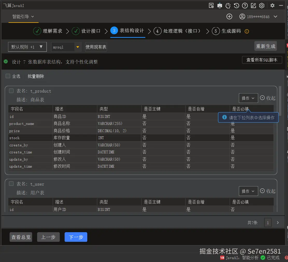 表结构设计输出: 飞算JavaAI为电商业务设计了包含t_product在内的7张数据库表,支持用户按需调整,并提供完整的建表SQL脚本,可直接在数据库中执行创建。