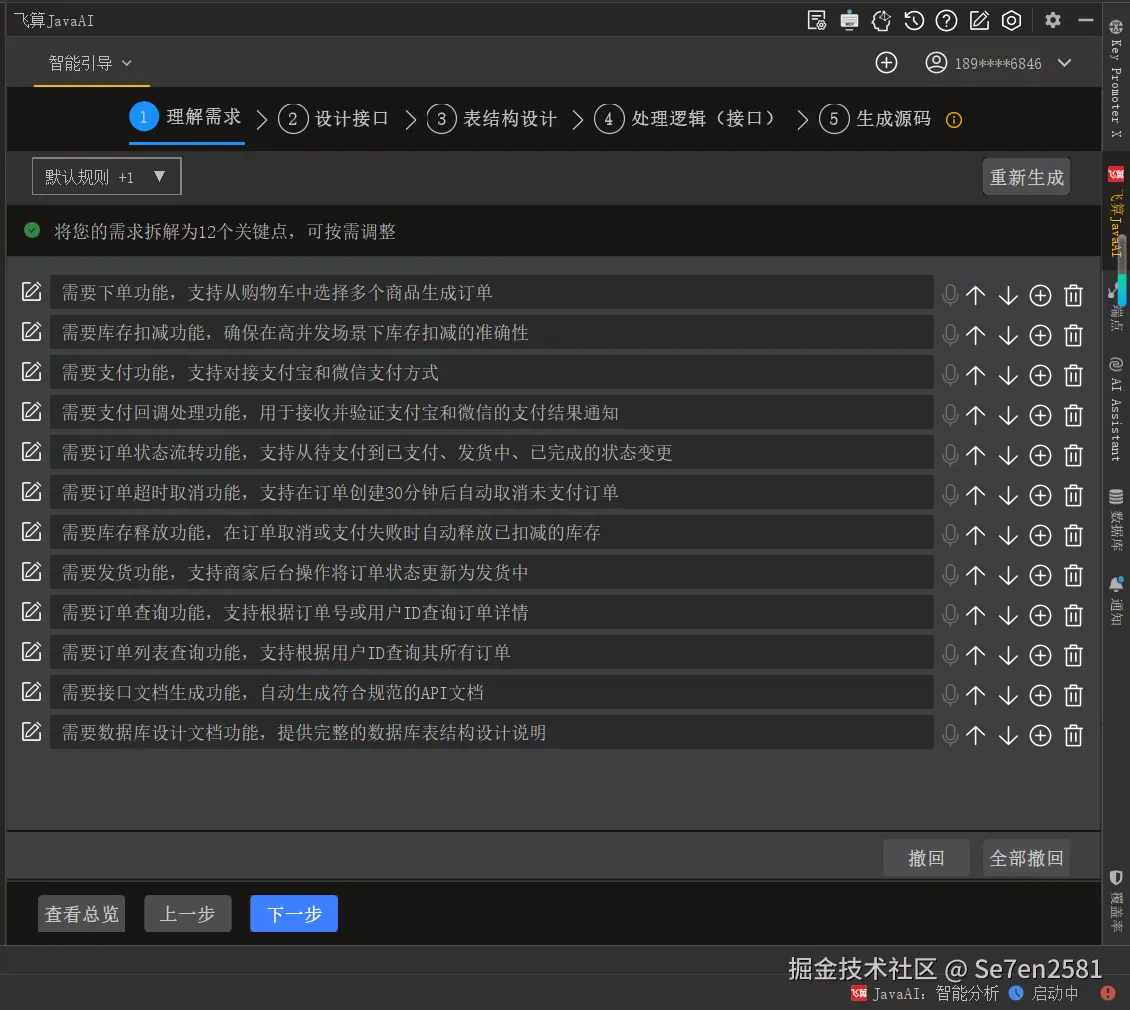 点击“开始生成”后,飞算JavaAI对需求进行语义理解,并拆解为多个子业务需求。