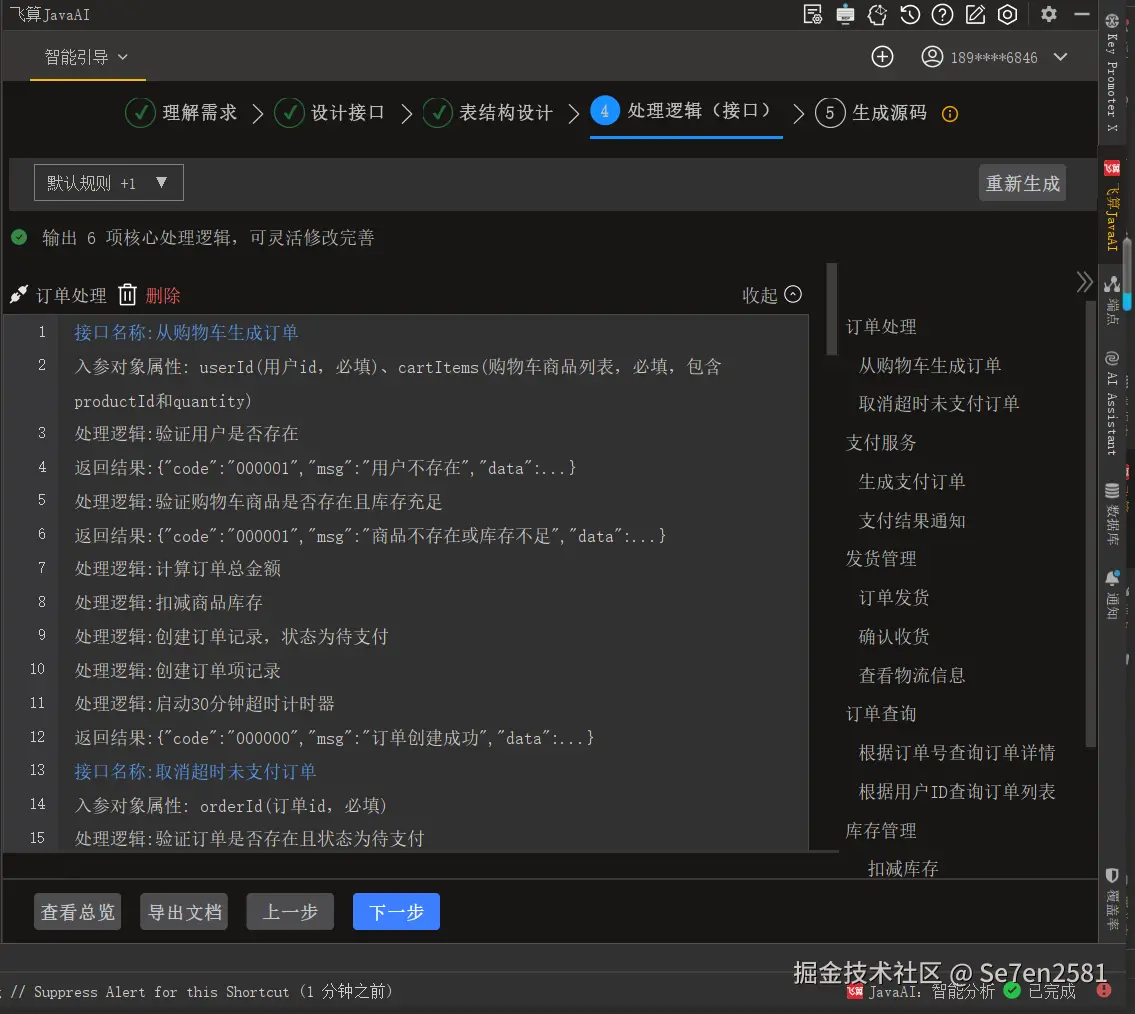 根据前三步的产出生成核心处理逻辑,并可对逻辑进行评审与灵活调整,确保符合客户需求。