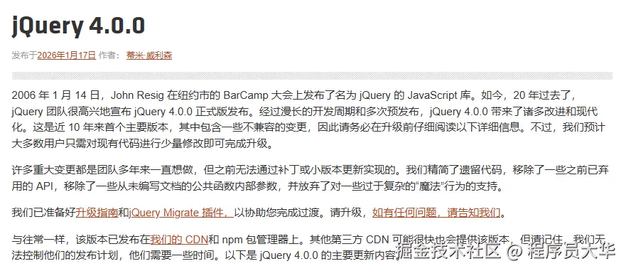 说实话,第一次看到 jQuery 4.0 发布 这个消息的时候,我是愣了一下的。