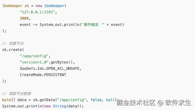 我们用 Java + ZooKeeper 原生 API 简单演示。