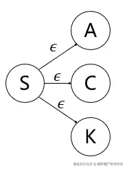 我们无法处理S->A | C | K是因为状态转移之前没有实义符号。“没有”意味着为空,前面提到,ε代表了空符号串,因此上式可看作是S->εA | εC | εK。
