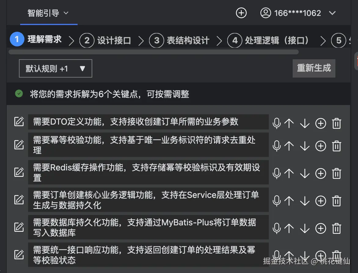智能引导一共分为五个环节,第一个环节是理解需求,核心是把我的业务需求自动拆解成一套标准化、可落地的技术实现模块,帮我梳理出开发一个完整接口需要的所有关键环节。
