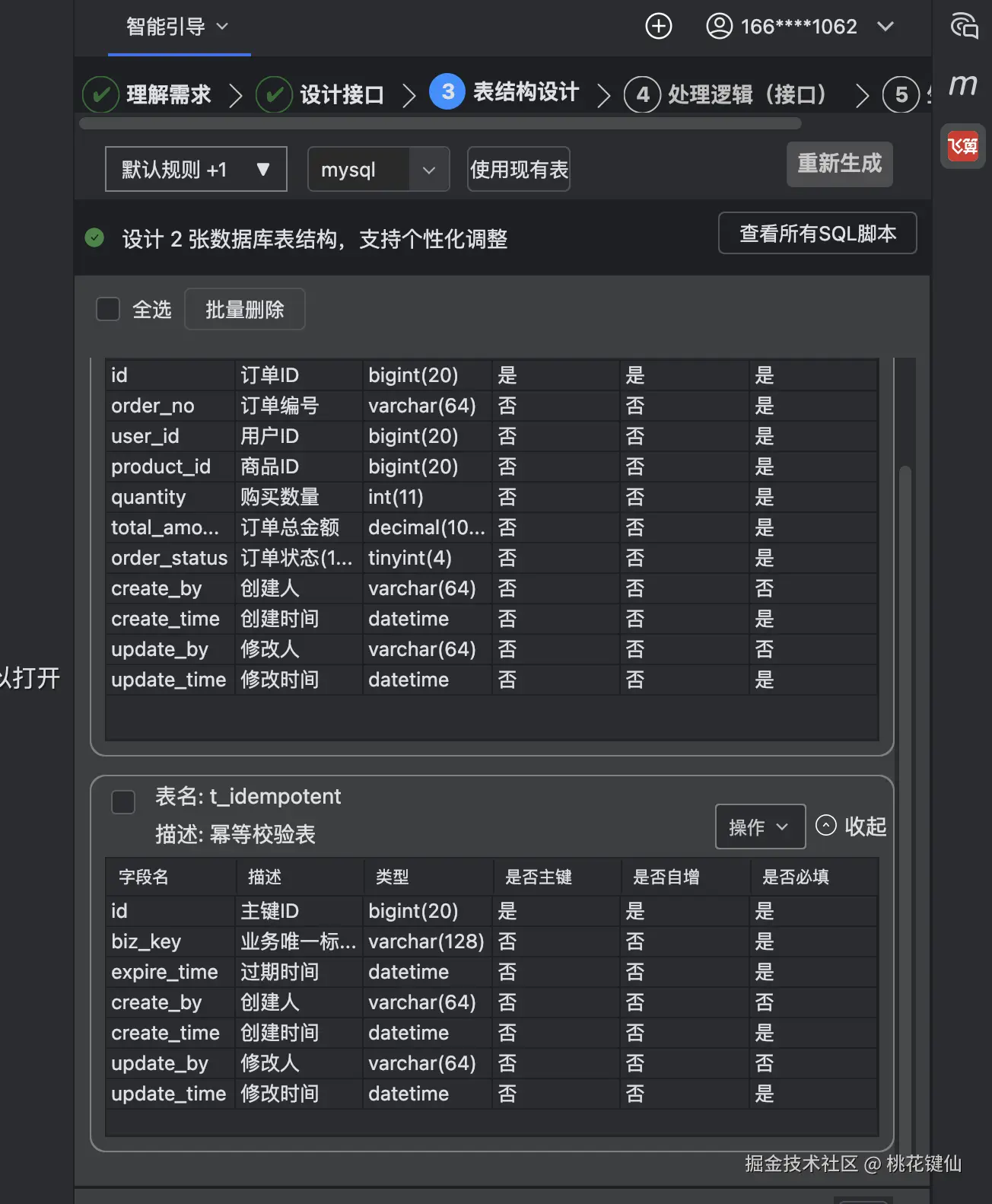 表结构设计功能的核心是基于我前面的业务需求和接口设计,自动生成配套的数据库表结构,让数据存储和业务逻辑完全对应起来,同时支持个性化调整。