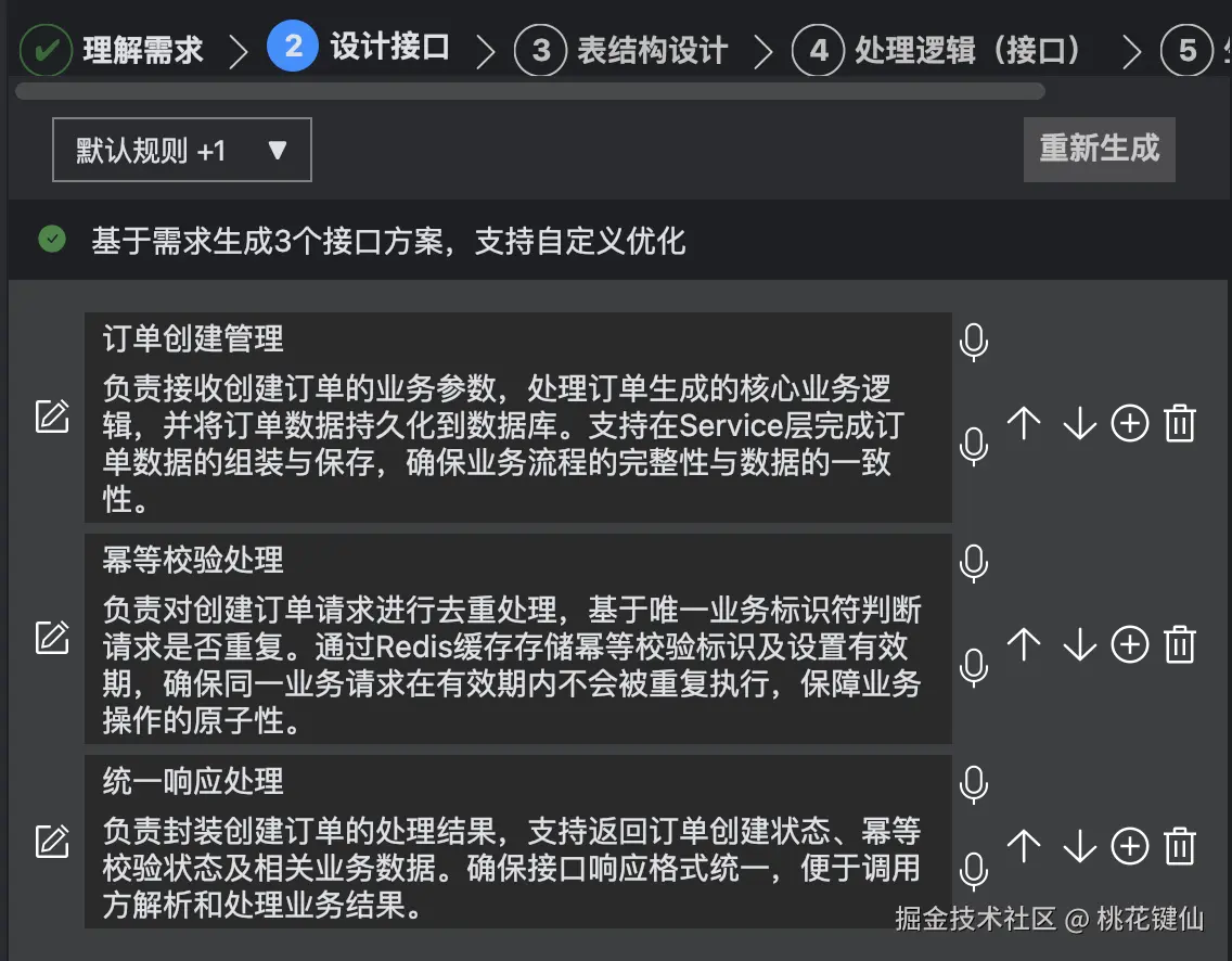 第二步是“设计接口” 功能,核心是把我之前拆解的业务需求转化为职责清晰、模块化的接口方案,帮我划分好不同功能的边界,让接口设计更规范、更易于落地。