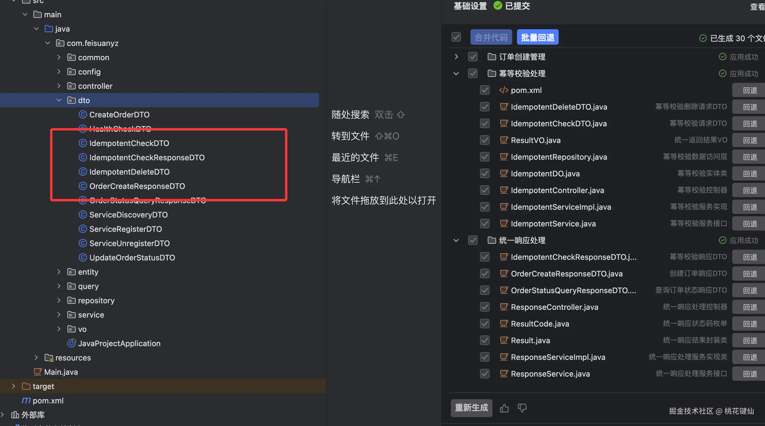 我尝试让飞算JavaAI专业版生成整个“订单服务”骨架。输入需求:“基于Spring Boot 3 + MyBatis-Plus,实现带幂等校验的创建订单接口,包含DTO、Service、Controller三层,使用Redis防重。”