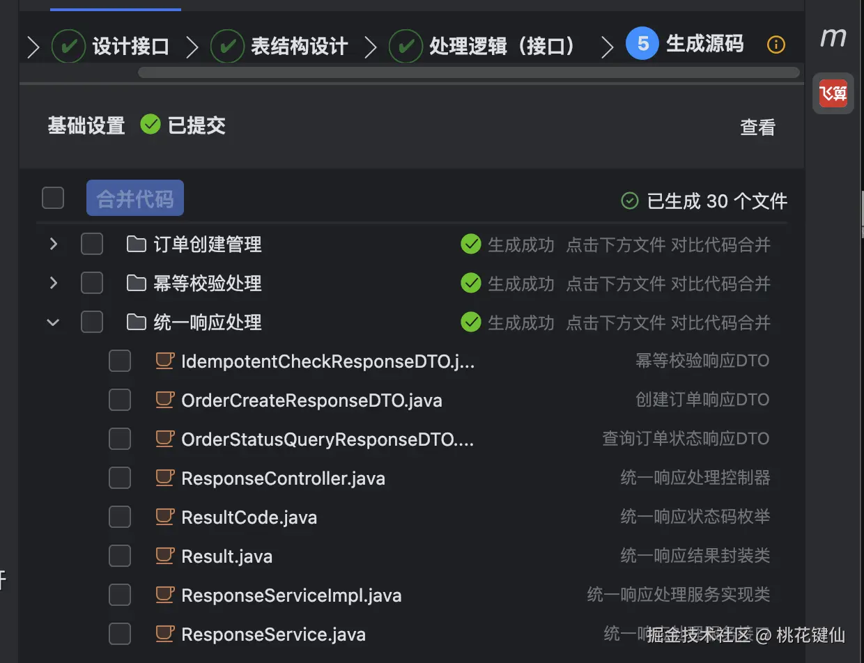 “生成源码” 功能,是整个开发流程的最终落地环节,它会把我前面所有的需求拆解、接口设计、表结构和处理逻辑,一键转化为完整、可运行的 Java 项目源码,相当于一个 “自动化的代码生成器 + 项目脚手架”。