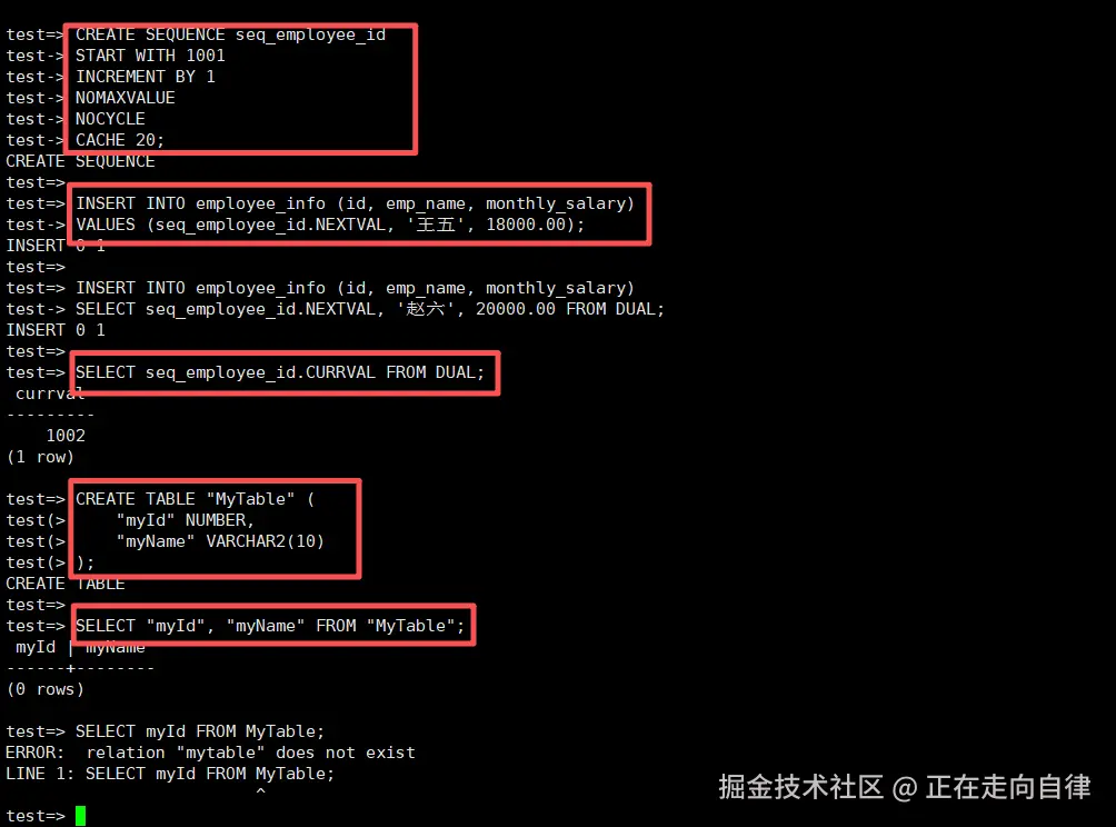 -- 创建序列,语法与Oracle完全相同
