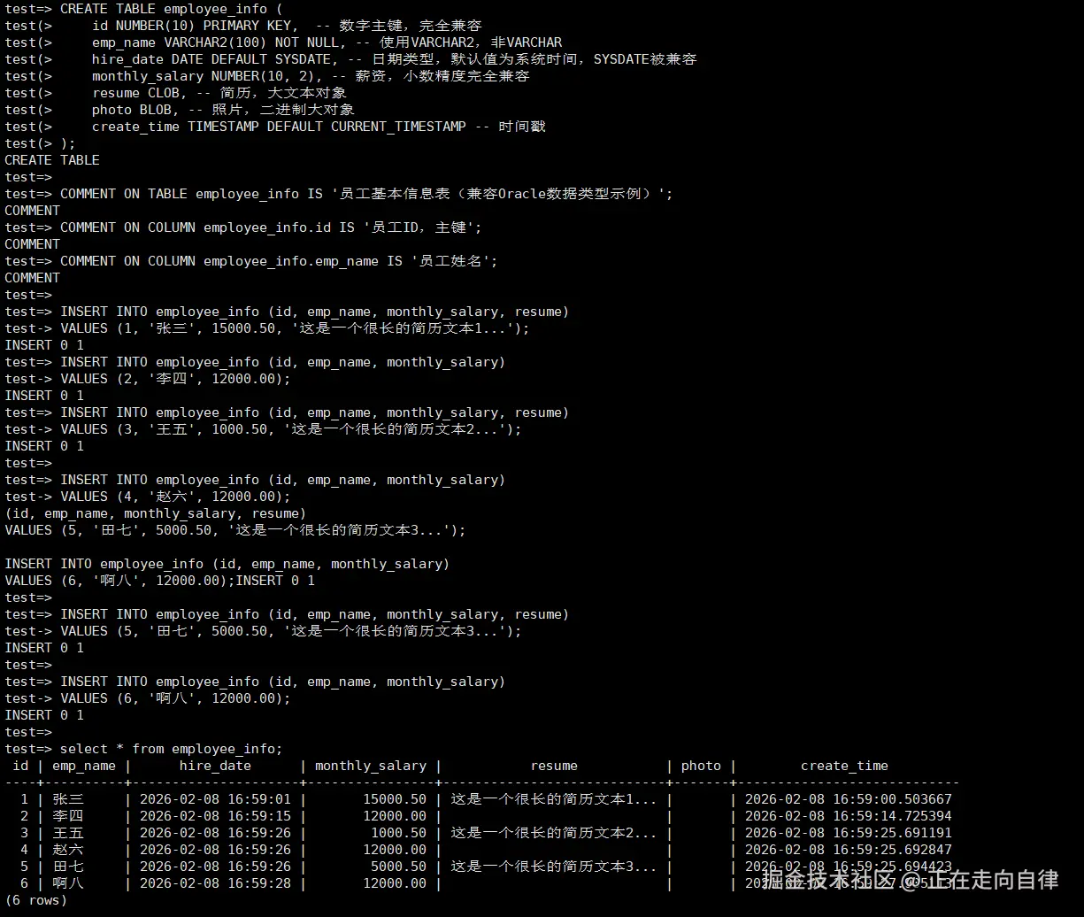 此示例演示如何在KingbaseES中创建一个包含多种Oracle兼容数据类型的表,并进行基本的DML操作。请注意,以下SQL在Oracle和KingbaseES中均可直接运行。