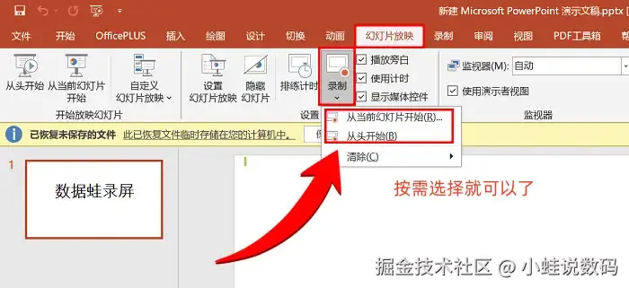 各位教师、准教师们,要是你们想录制微课程,快来看这里!PPT里其实藏着录屏功能~ 电脑端怎么操作呢?只需打开任意一份PPT讲稿,点击上方工具栏中的 【录制】 选项卡,就能找到屏幕录制的功能按钮。