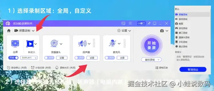 免费好用屏幕录制软件?优加蛙录屏软件提供全屏、自定义区域、窗口、游戏、音频、摄像头画中画等多种录制模式,适配多场景使用需求。