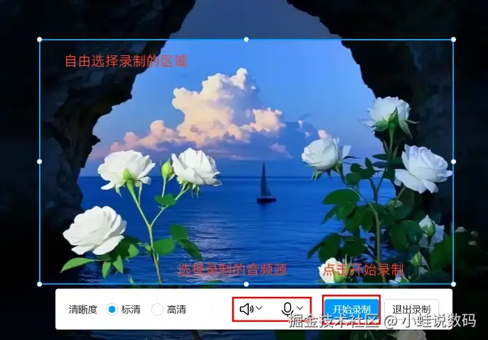 第二步:进入录制前配置页面,用户可根据自身需求设置录制范围大小和音频选项,若需更个性化配置,点击上方 【设置】 按钮调节输出尺寸与格式;参数全部调试完毕,点击 【开始录制】 按钮启动;