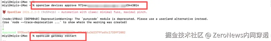 # 设备授权命令# Requst ID 替换成您自己的IDopenclaw devices approve <Request ID> #重启网关命令openclaw gateway restart