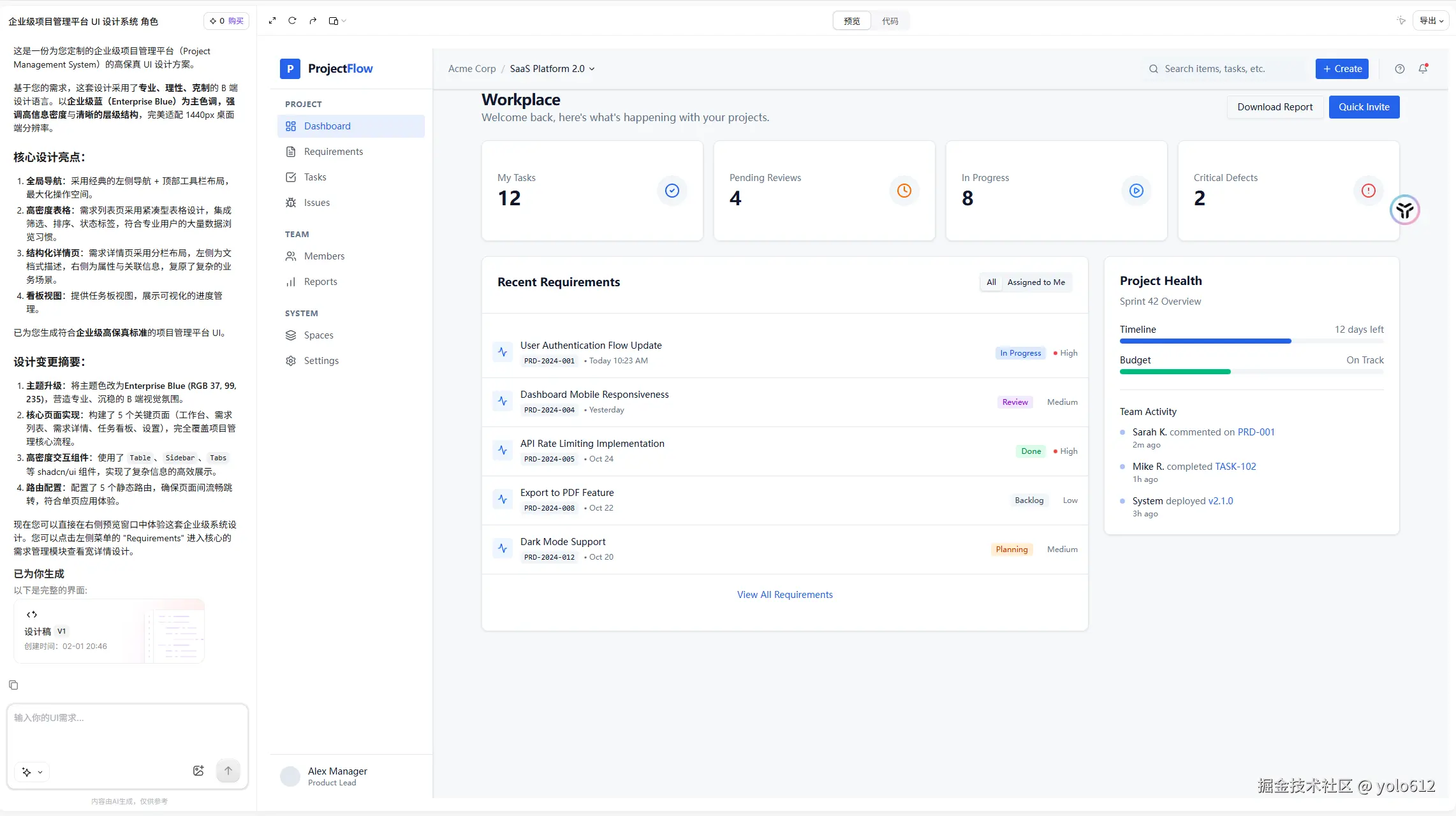 规范一致性:基于 Ant Design、Material Design、Shadcn 等成熟设计系统生成,确保产出物符合工业标准。