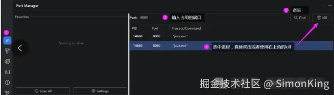 因为本地端口占用不常有,Windows/Mac下的查找占用的命令,有不熟悉,只能豆娘来解决。终于发现一款IDEA插件可以无视命令,点点鼠标就能解决:Port Manager