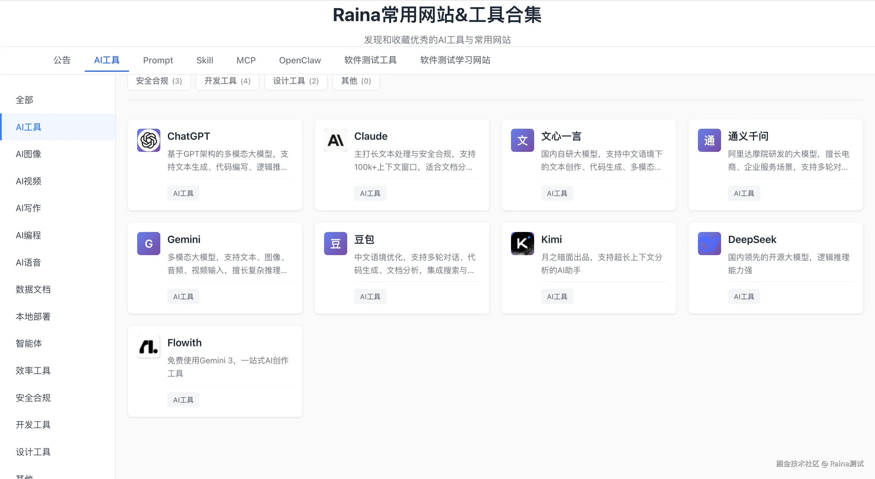 - 按场景分好类:顶部有「AI 工具、Prompt、Skill、MCP、测试工具」等快速标签,左侧还有细分分类,想找哪类工具,点一下就出来;