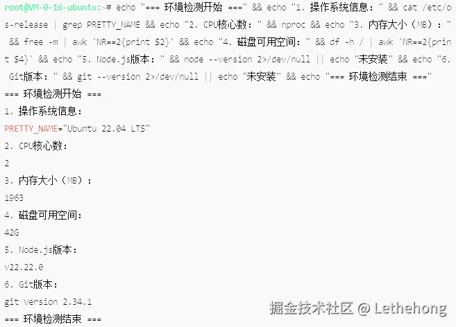 安装前先确认服务器配置是否达标,同时检查 Node.js 和 Git 这两个必备依赖有没有装,执行下面的命令一次性检测所有关键指标: