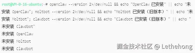 先检查服务器里有没有装过 OpenClaw,或者它的旧版本 Moltbot/Clawdbot,避免版本冲突,直接执行下面的检测命令就行: