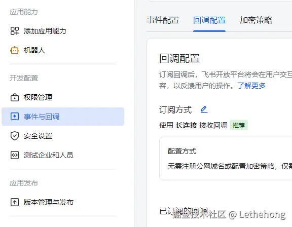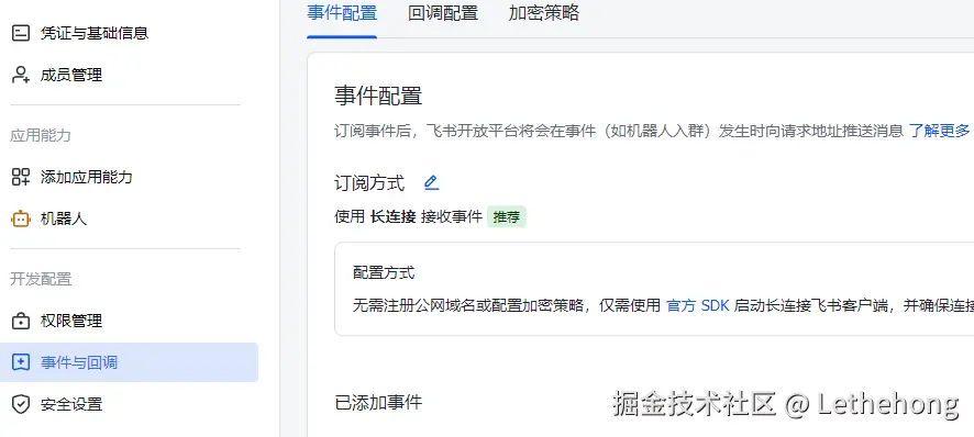再回到飞书开放平台,找到「事件与回调」——这两个选项缺一不可,必须都配置好!然后在回调方式里,选择「长连接」,保存即可。如果提示连接失败,不用慌,大概率是上一步网关没重启到位,回去再执行一次重启命令,基本都能解决,我亲测过三次,都是这个问题!