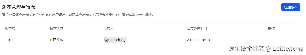 最后一步,发布插件才能用!点击左侧菜单栏的「版本管理与发布」,先点击「创建版本」,不用改其他设置,直接提交,然后点击「申请发布」,飞书的审核很快,几分钟就通过,发布完成后,插件就正式生效了。