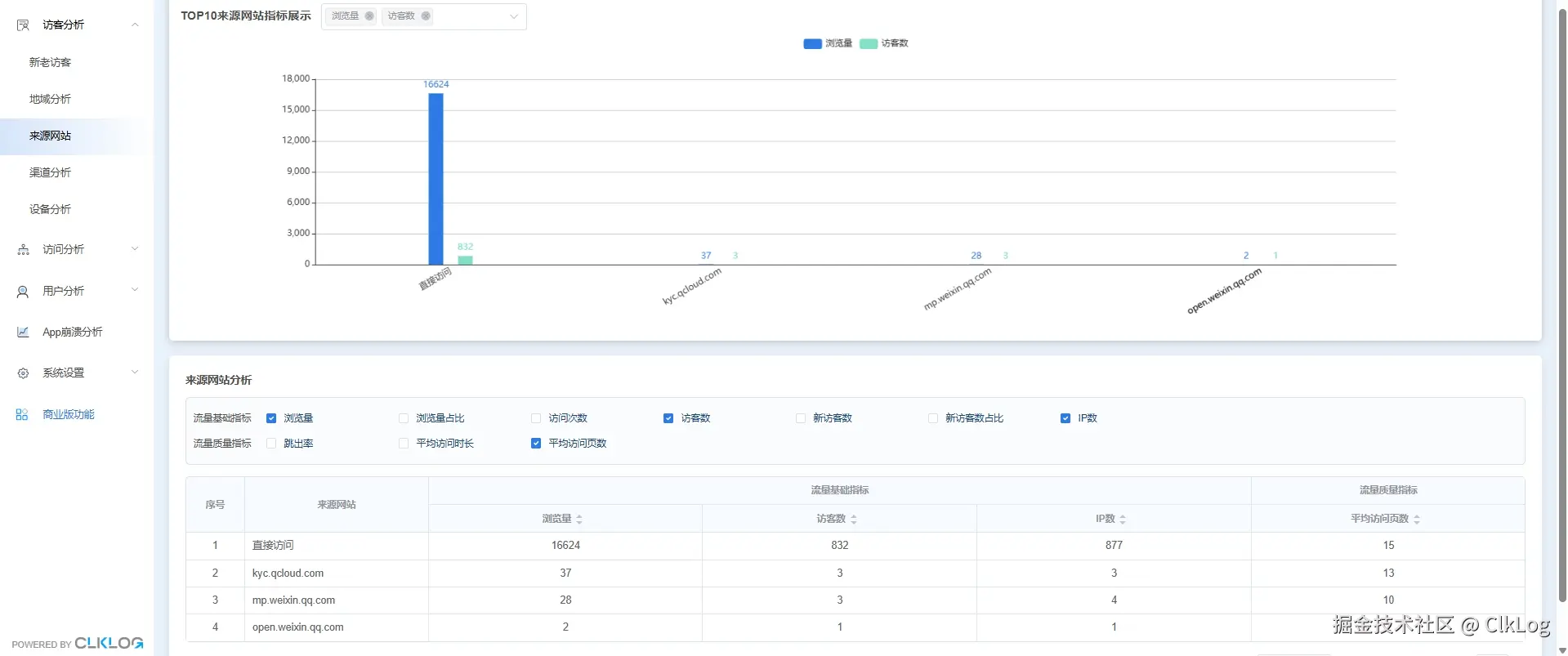 在ClkLog的设计中,我们做了一件看起来“很简单”,但在实际项目里非常关键的事情:内置了开箱即用的成熟用户行为分析模型(如基础访问、访问来源等)。