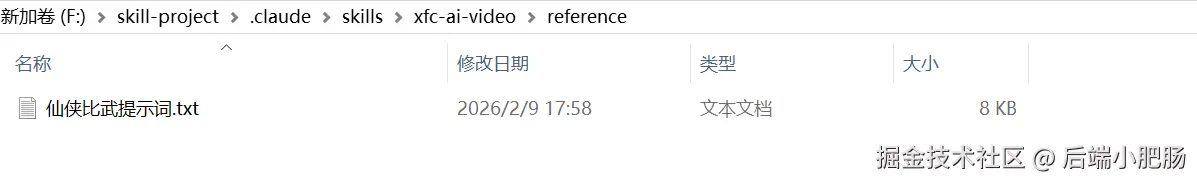 基于目录设计,在.claude目录下新建项目文件夹,如下图所示,我在F:\skill-project.claude\skills\目录下新建了xfc-ai-video目录。