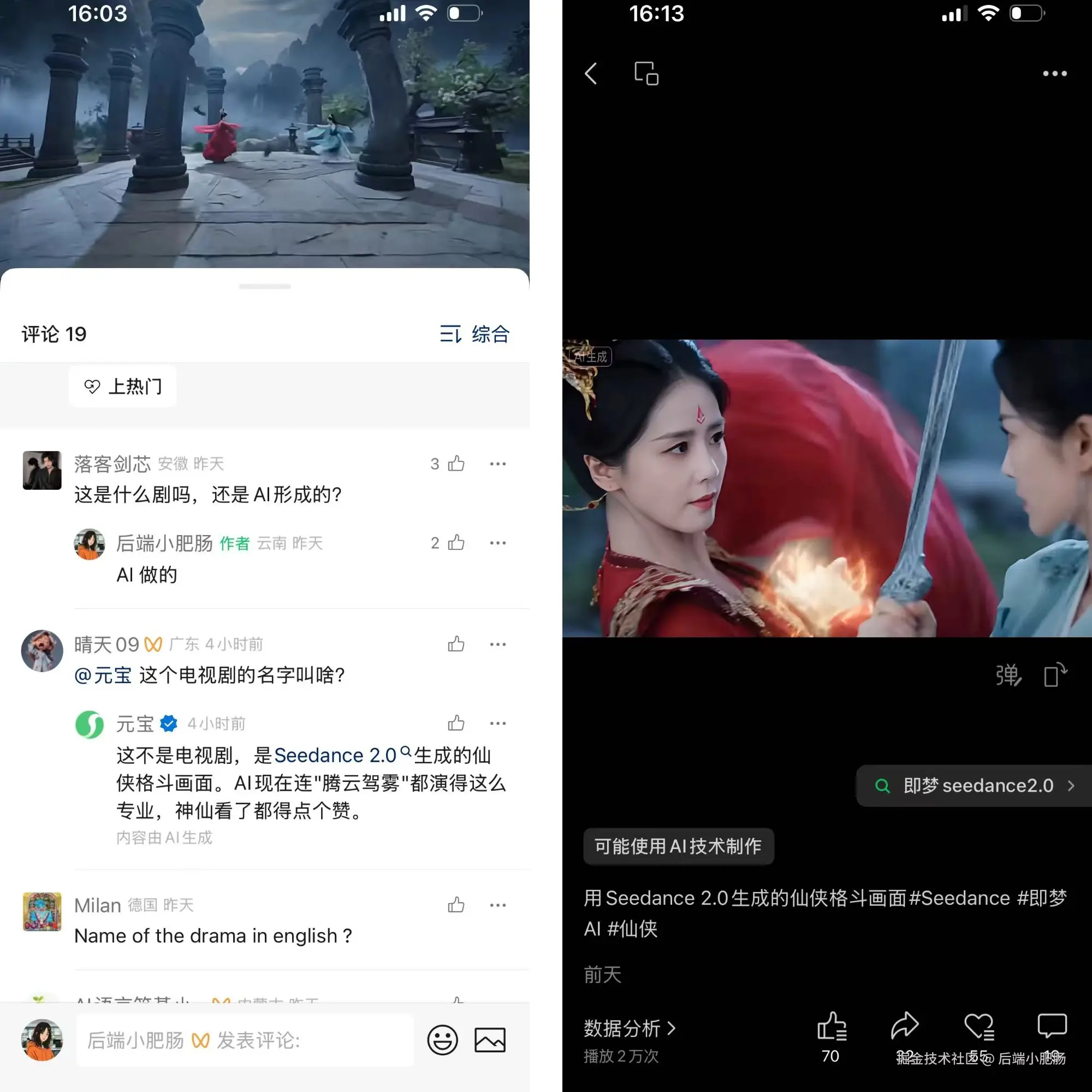 这两天 AI 视频圈彻底被 Seedance 2.0 刷屏了。周六我也去深度体验了一把,顺手发的两个测试视频居然小爆了一下,评论区全是问:“这是哪部新出的电视剧?”