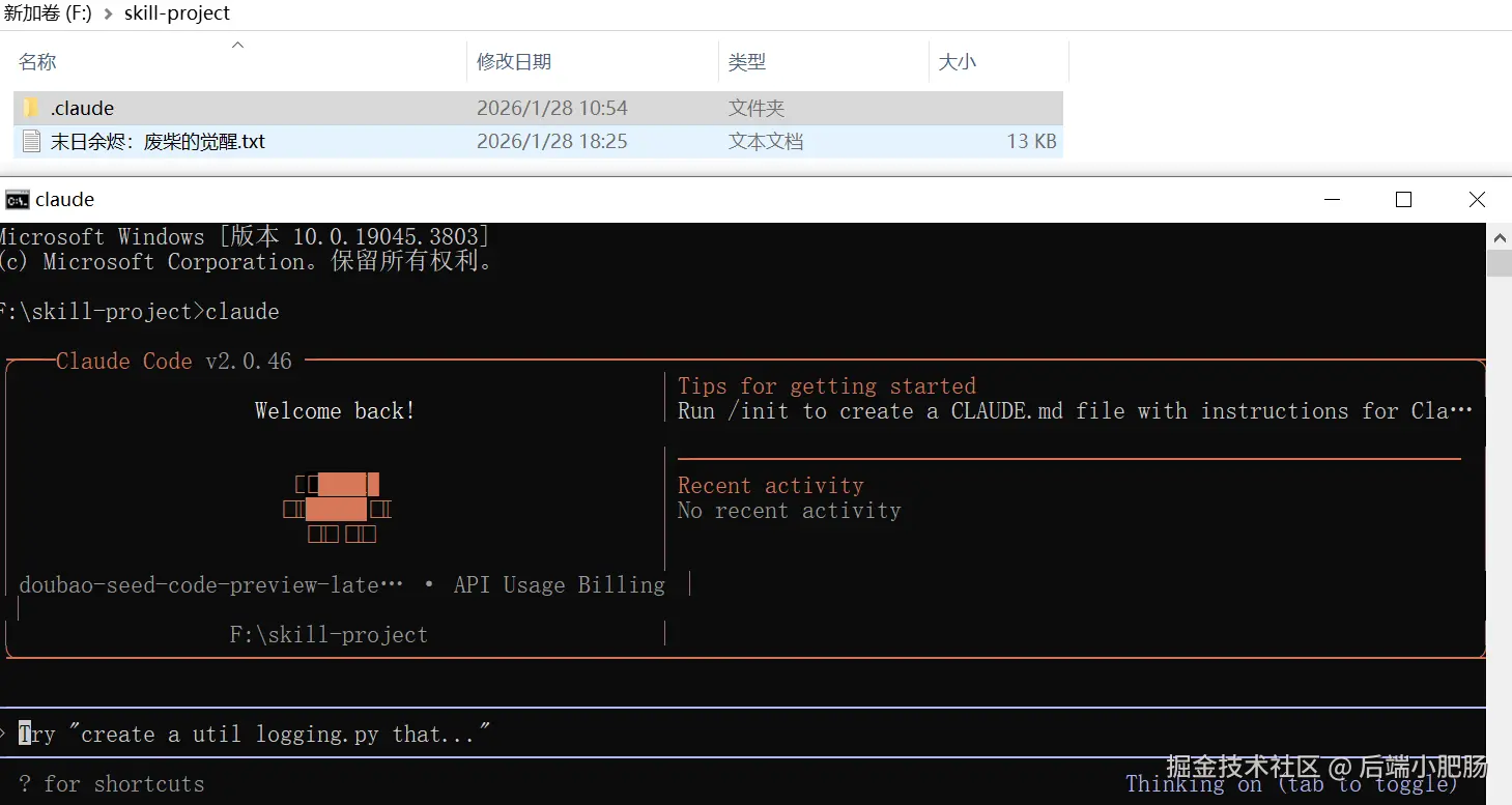 到这一步skill就制作完成了,接下来进入测试环节,回到.claude上级目录,在文件路径处输入cmd打开命令提示符,输入claude进入claude code。