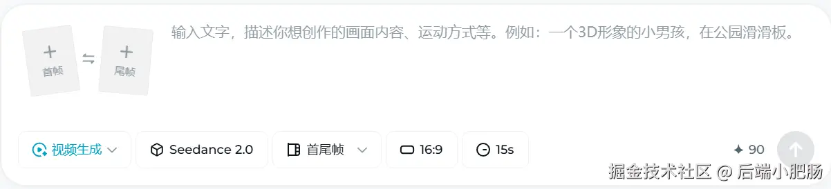 在底部会话框中选择视频生成,模型选择"Seedance2.0",模式选择"首尾帧",屏幕比例自行选择,视频时长选择"15s"。
