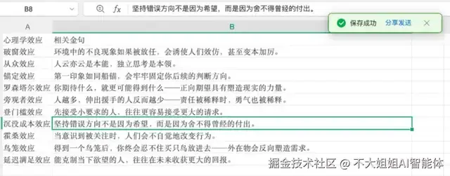 我们将 DeepSeek 生成的文案,先整理到 Excel 表格中。 这一步是为了建立标准化的数据源,方便后续的设计软件读取。