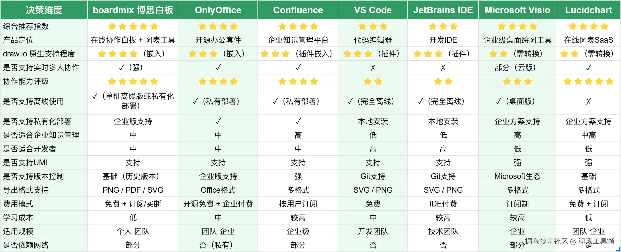 为了帮助你更直观地选择合适的打开drawio文件的工具,我们从drawio支持程度、是否支持实时协作、是否支持离线使用、是否支持私有化部署、学习成本等多个维度进行了详细对比: