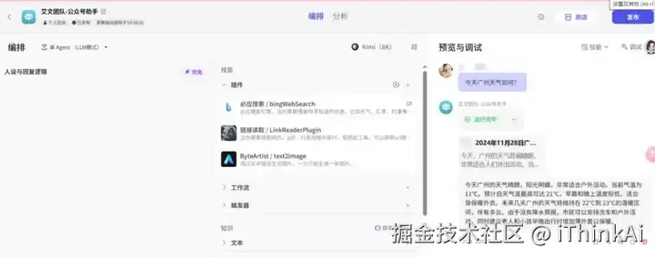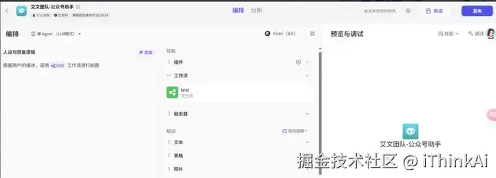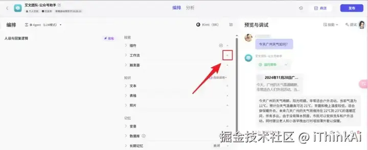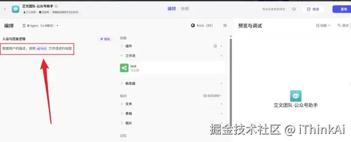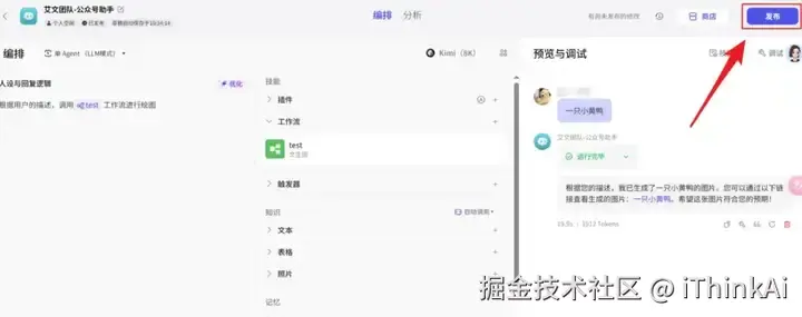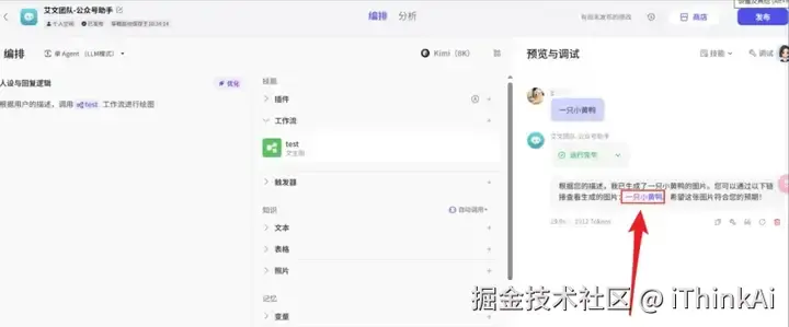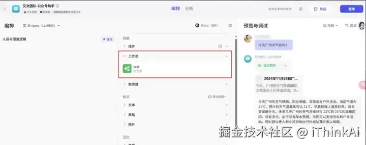 •测试该工作流是否生效,在预览与调试界面输入指令并发送