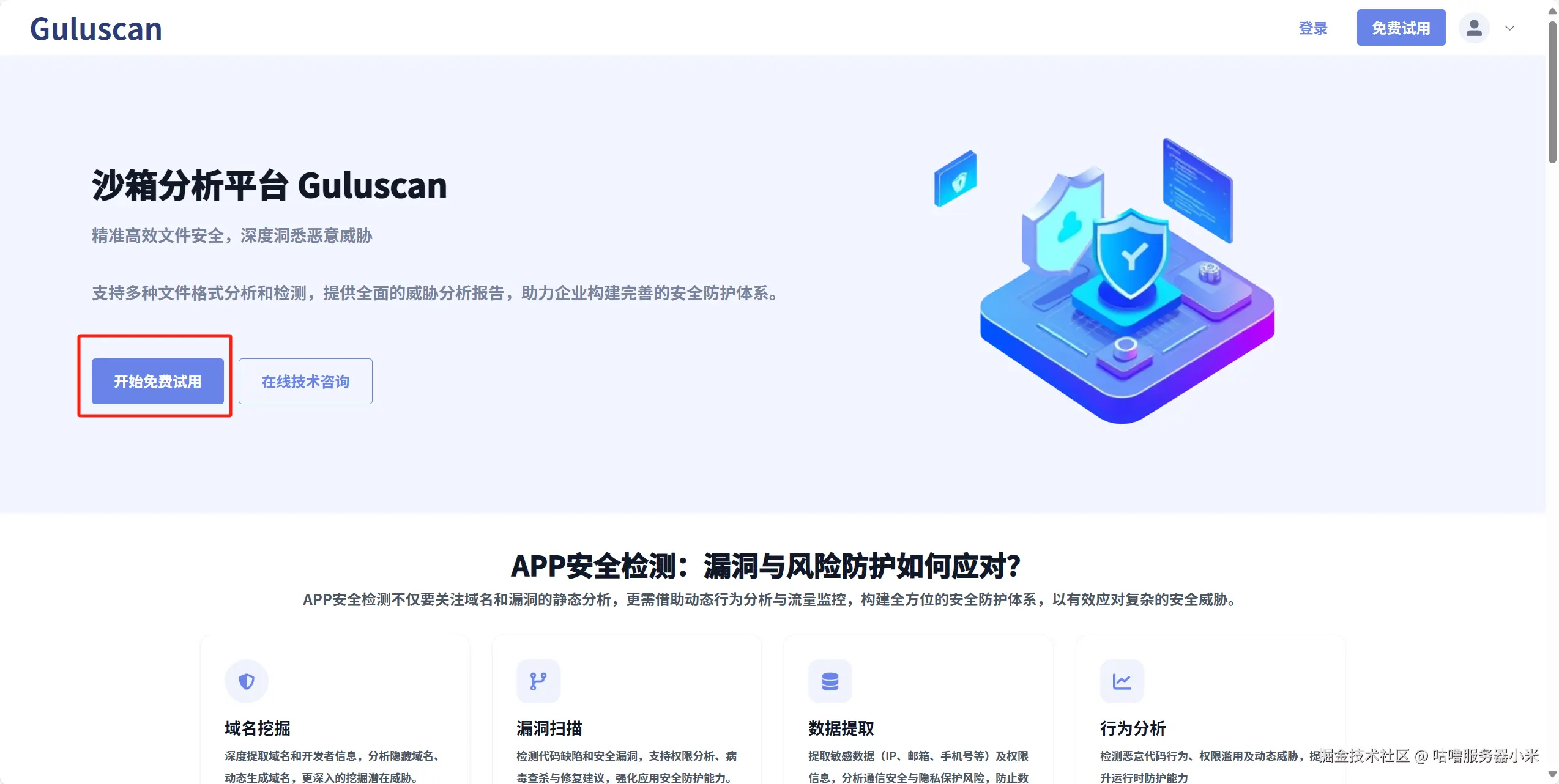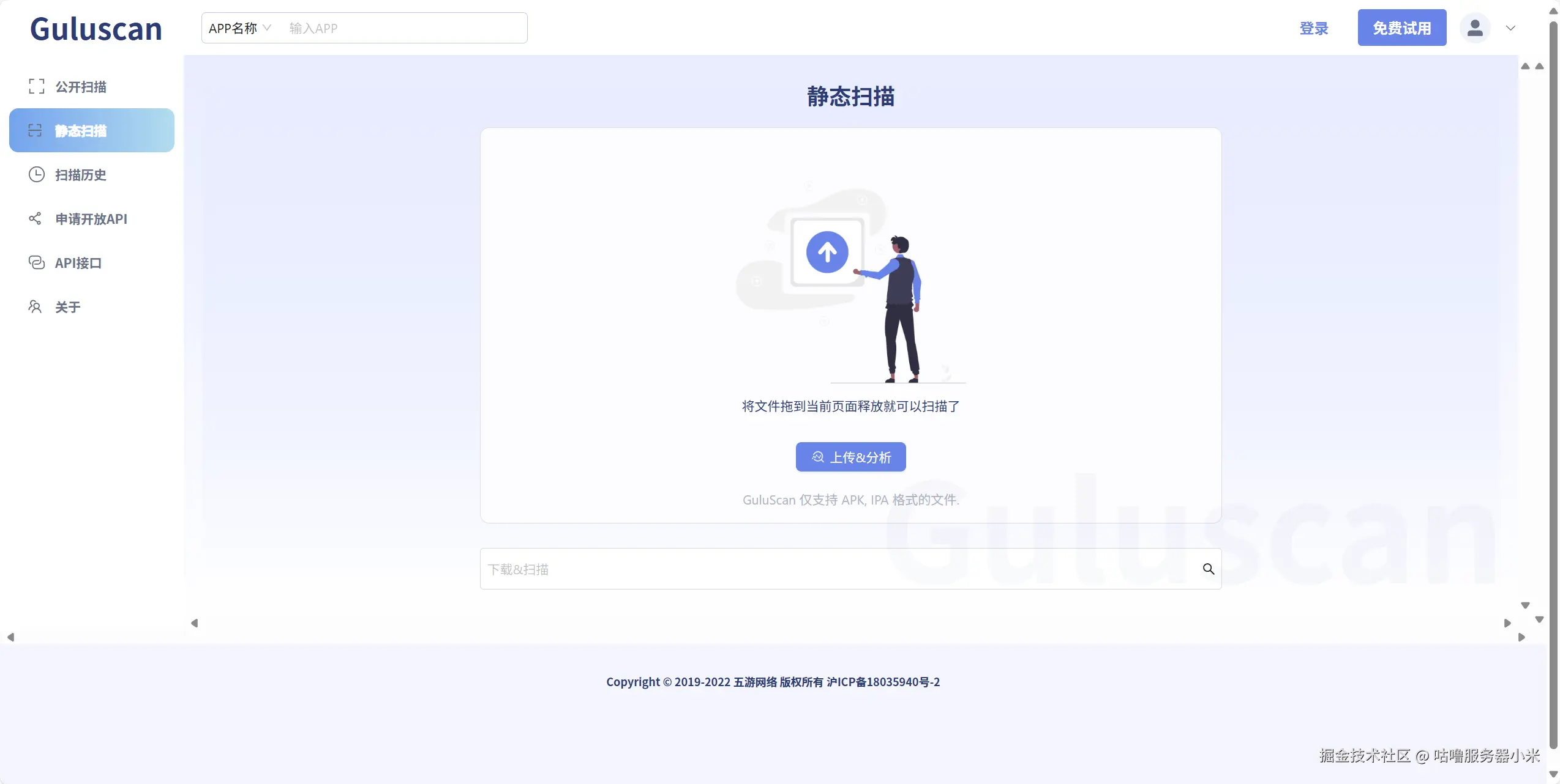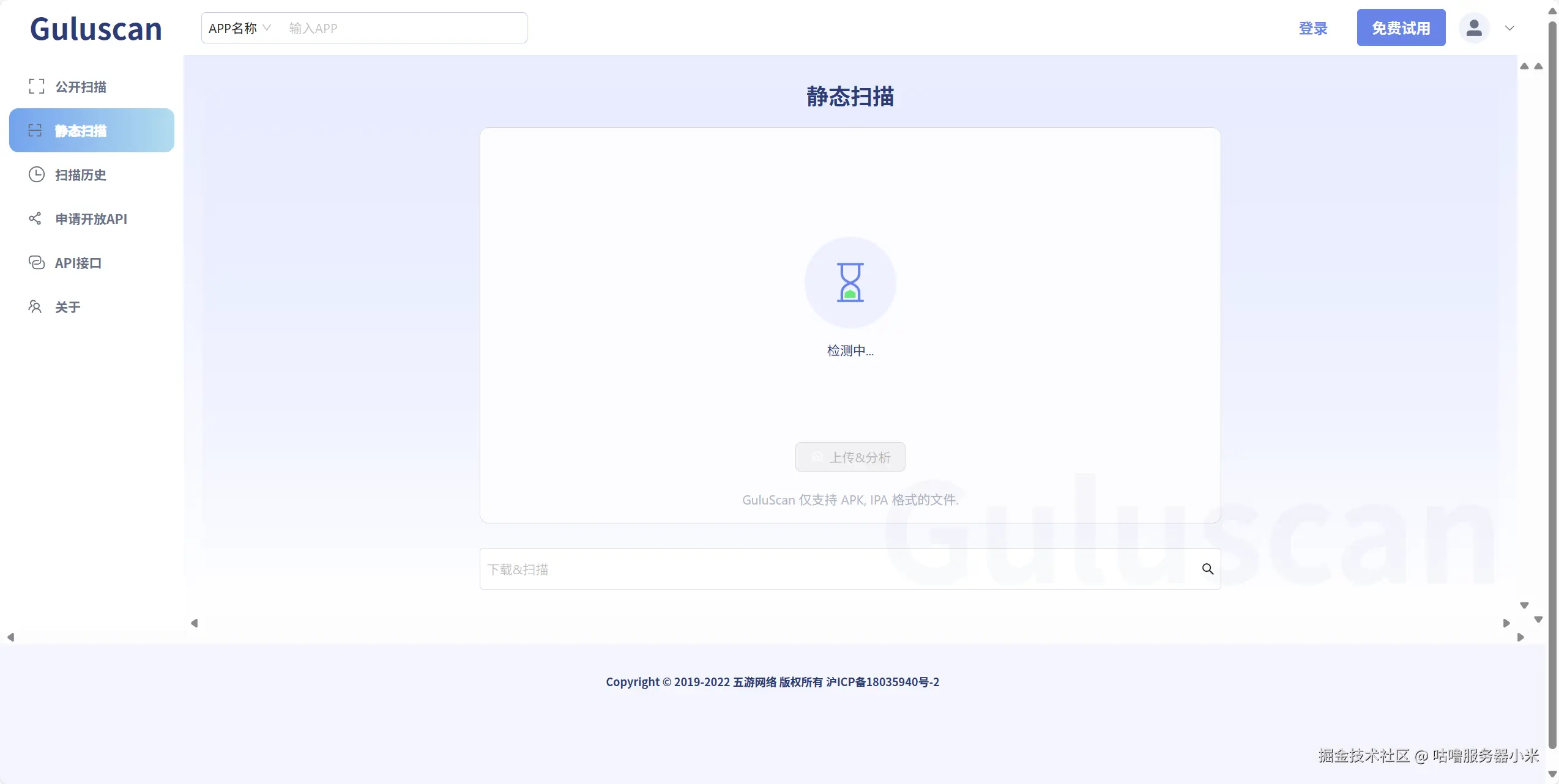 无需复杂环境搭建,登录咕噜分发官网后,在顶部导航栏找到「工具箱」模块,点击子菜单「APP漏洞分析」即可进入Guluscan沙箱分析页面。核心准备工作仅需两步:一是确认待检测文件格式(仅支持APK、IPA格式,需提前完成应用打包),二是建议完成账号登录(未登录时扫描历史默认公开,登录后可保护分析记录隐私)。我们团队会在每次版本迭代打包后,直接进入该功能进行漏洞自检,无需额外配置测试环境。