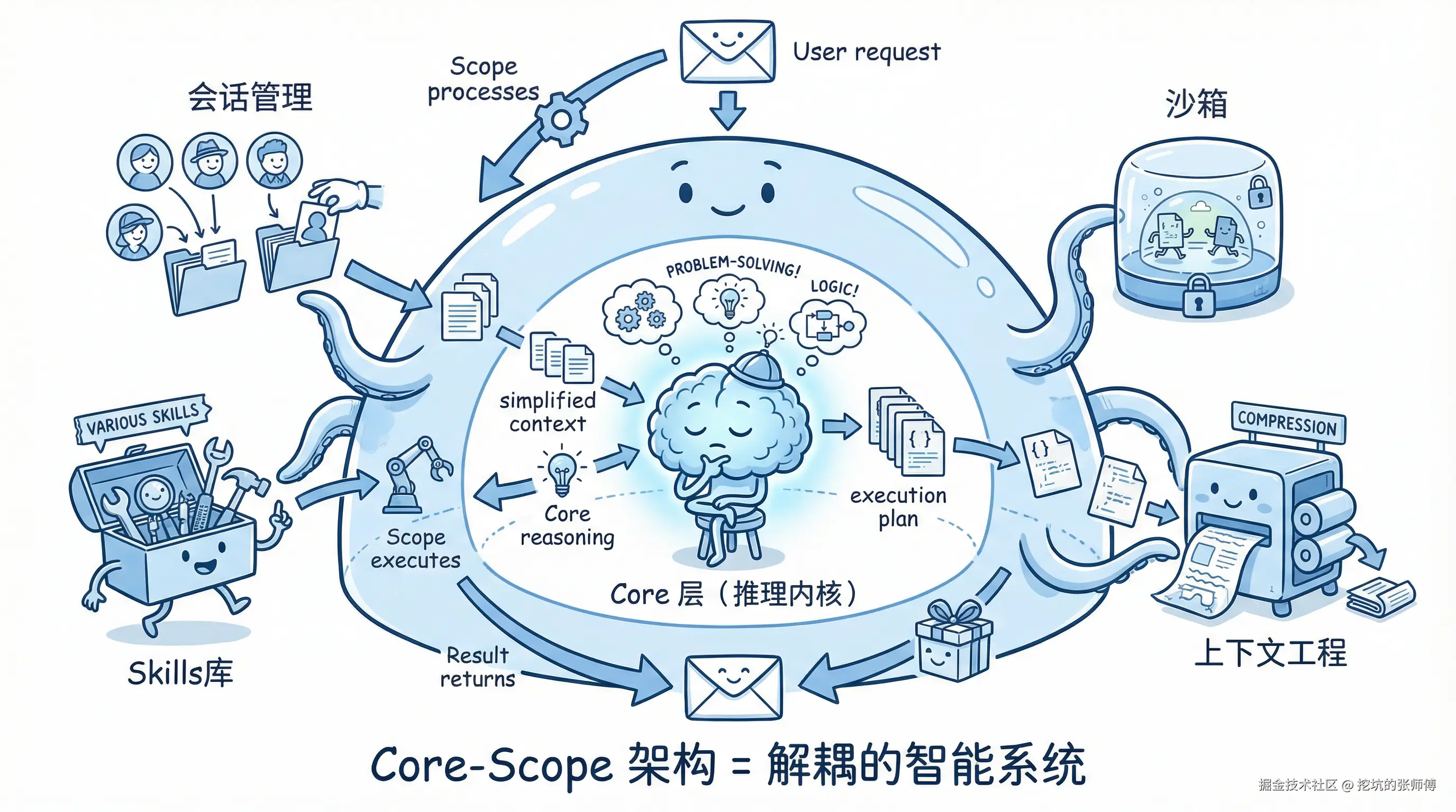 试图从零构建一个“全知全能”的Agent是低效的。正确的路径是站在巨人的肩膀上,采用“内核 (Core) - 外壳 (Scope)”的双层解耦架构。