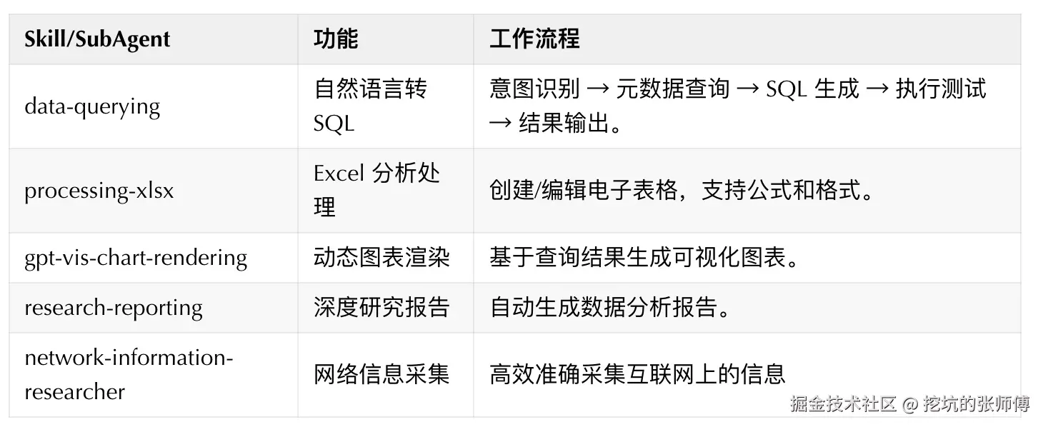 Skills 体系:DataAgent 通过 5 个领域 Skills 扩展能力。