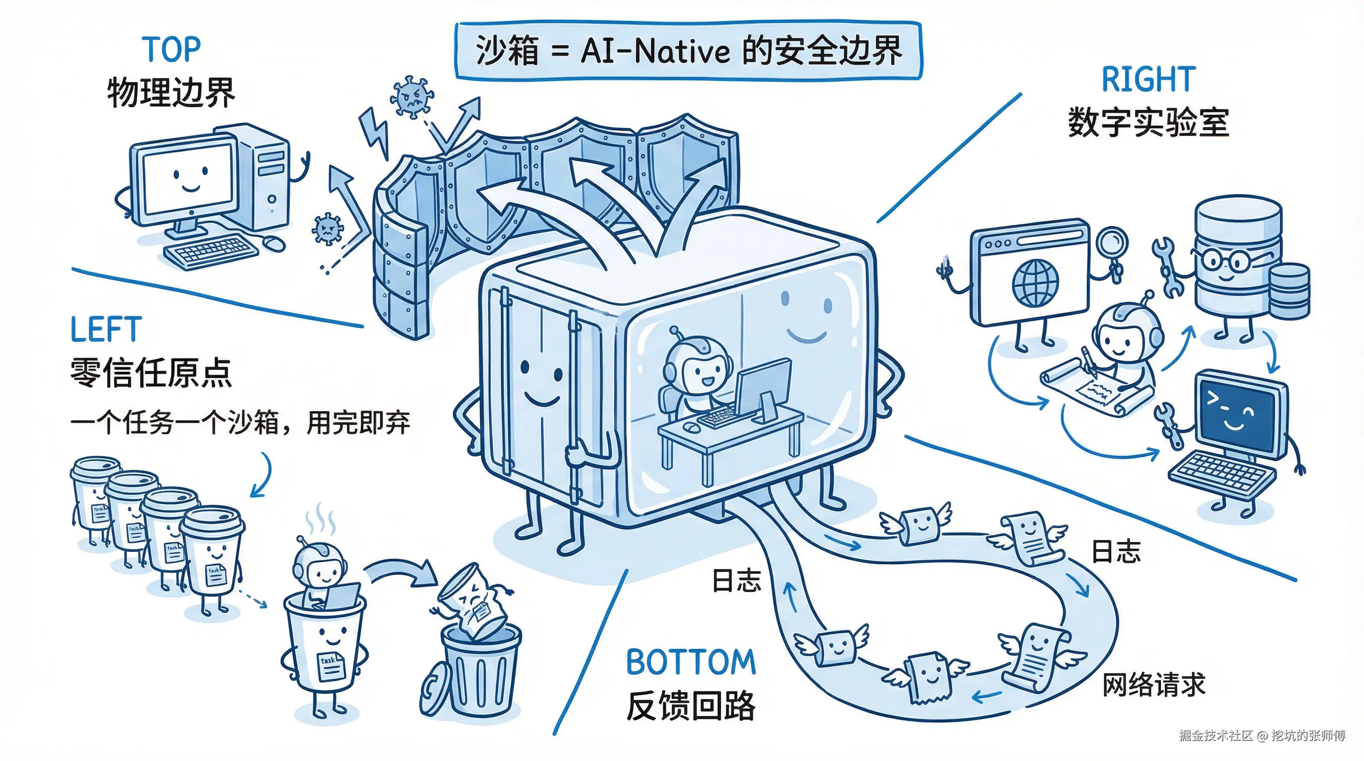 Coding Agent 本质具备图灵完备的破坏力(如删库风险)。沙箱(Sandbox)不仅是隔离环境,更是 AI-Native 的物理安全边界,主要承担四项职能: