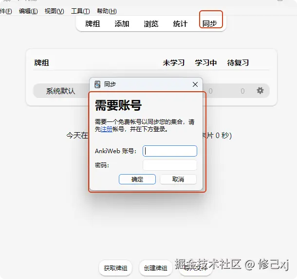 点击同步页签,配置AnkiWeb 的账号及密码,将AnkiWeb的信息同步到windows