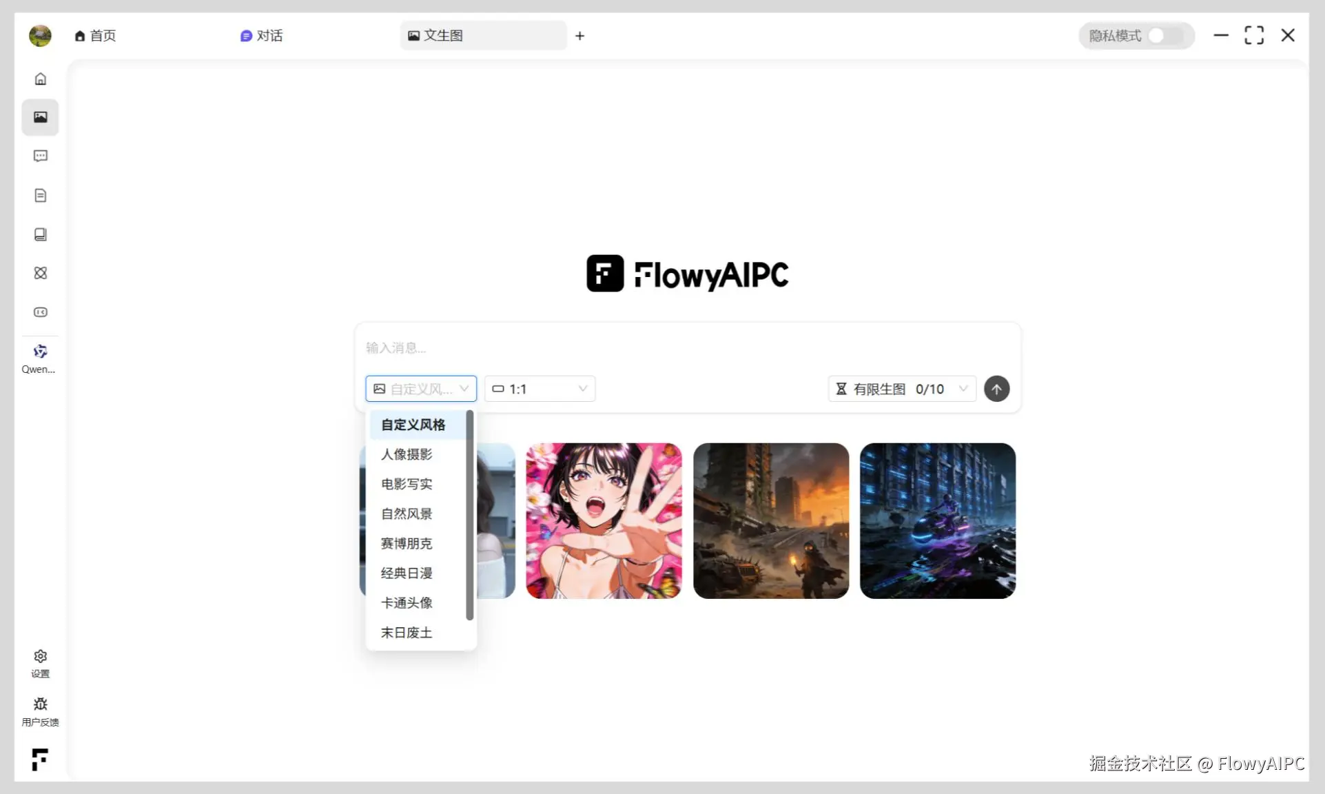 在 v4.1.2 版本中,FlowyAIPC 对文生图功能进行了重点增强,新增多种常用且高频的生图风格选择,满足不同创作场景的需求。新增生图风格类型: