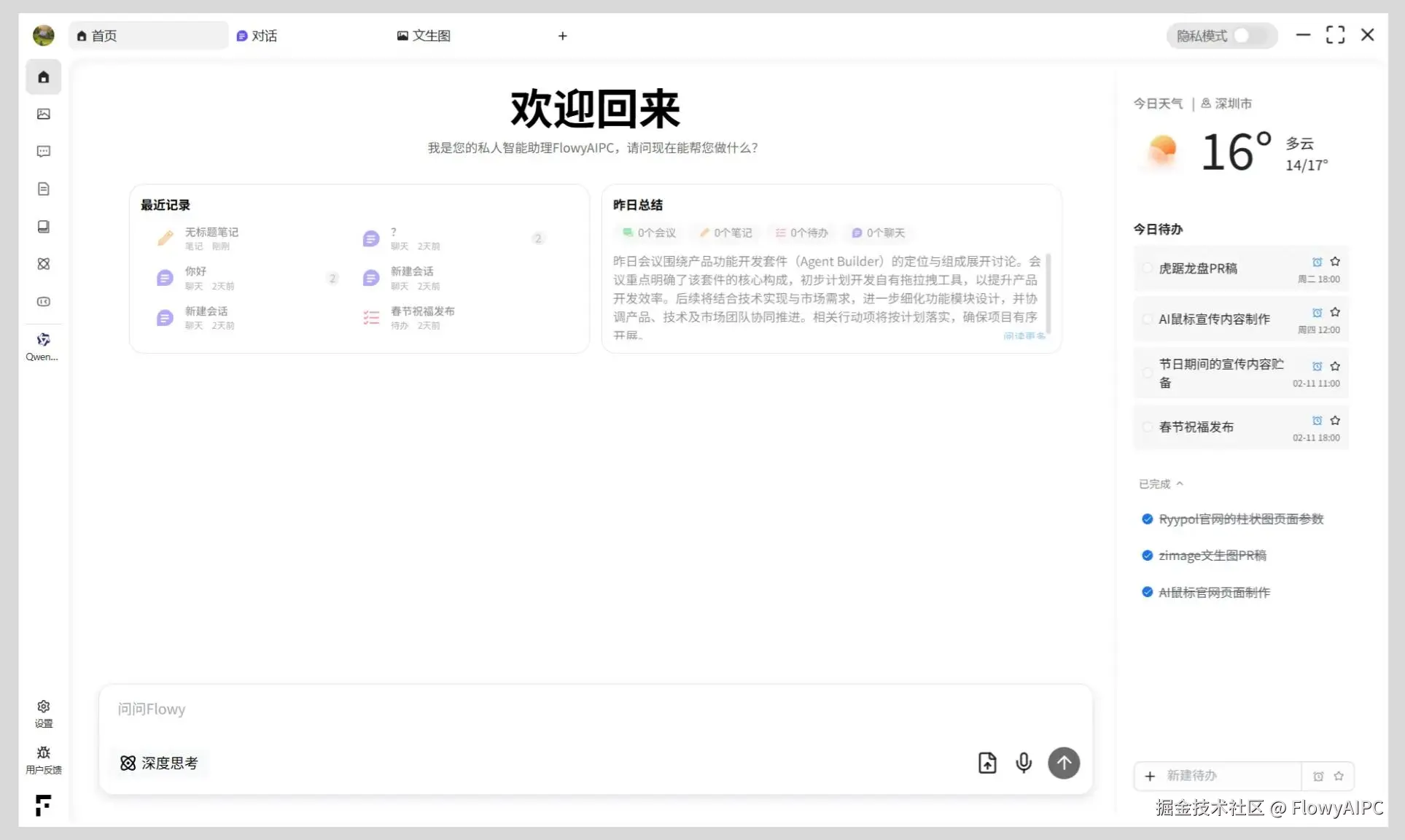 【2026年02月09日】 FlowyAIPC 现已更新至 v4.1.2 版本。本次更新围绕 本地文生图能力、硬件兼容性以及整体交互体验 进行了集中优化,进一步降低使用门槛,同时释放本地 AI 的性能。
