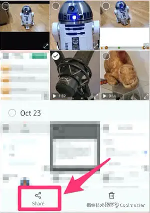 步骤二:找到你想发送的视频,按住它大约两秒钟。松开手指后,就会出现 “分享” 按钮。点击它。