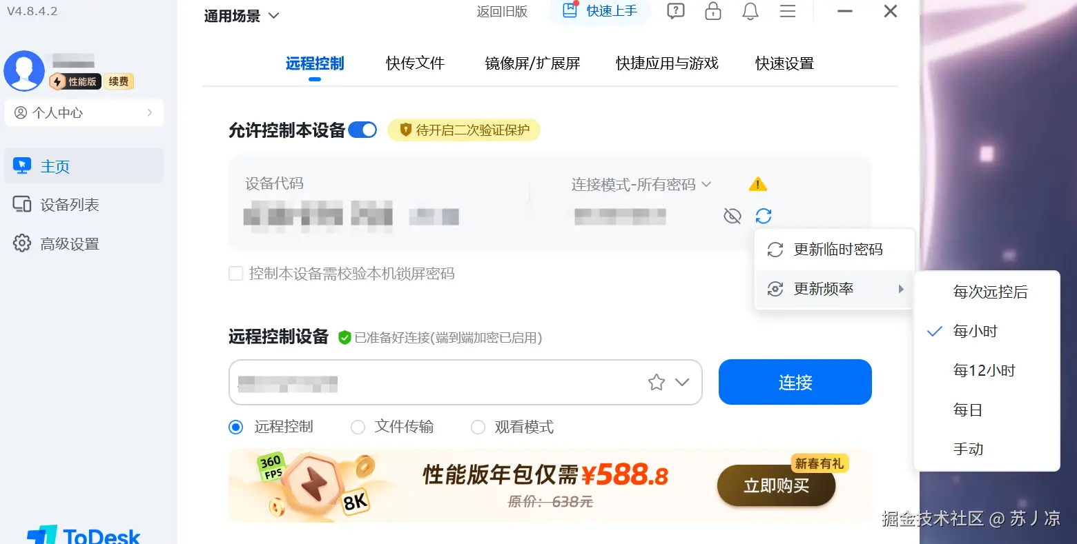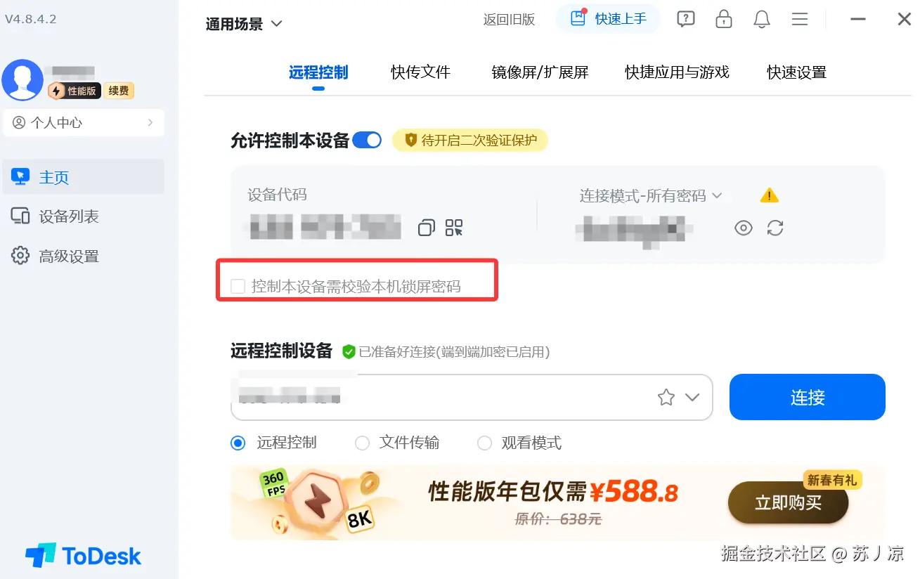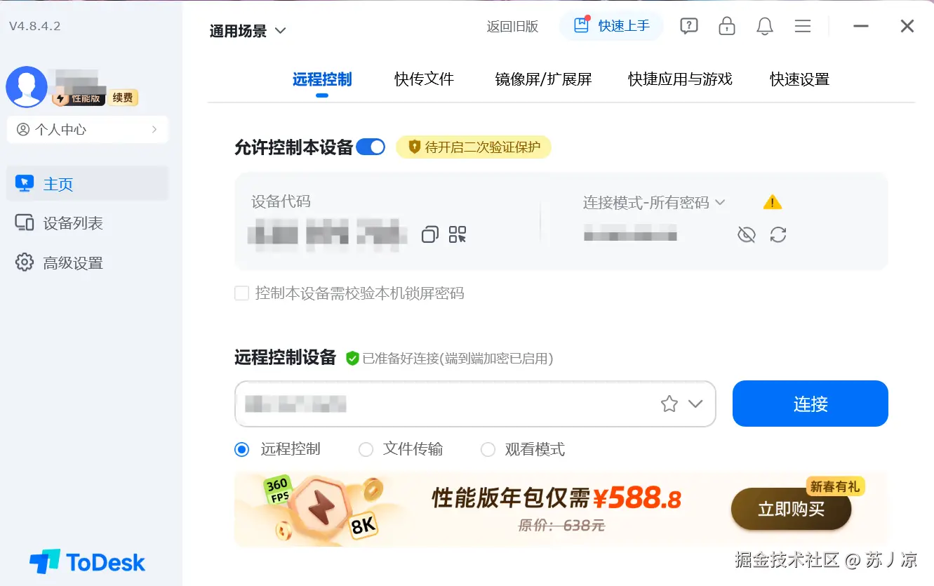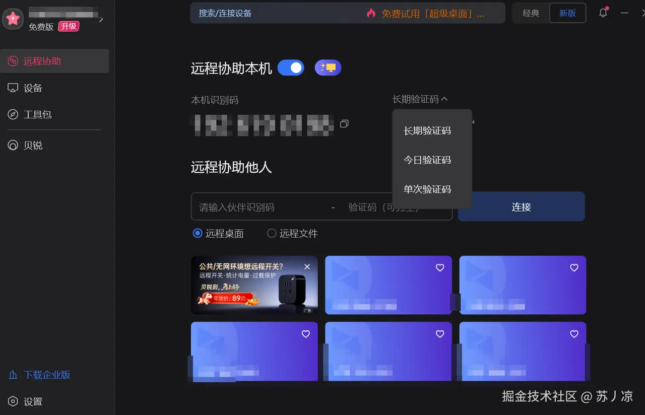 但ToDesk的安全防护远不止于此。它提供了业内最完善的二次验证保护机制。当有新设备尝试连接时,系统会自动向账号绑定的手机发送验证码,只有输入正确的验证码才能完成连接。这个功能在实际测试中表现出色:我故意将设备码和密码泄露给测试账号,结果发现即使拥有正确的凭证,攻击者仍然无法完成连接,因为他们无法获取我手机上的验证码。这种设计有效防止了密码泄露导致的安全风险。