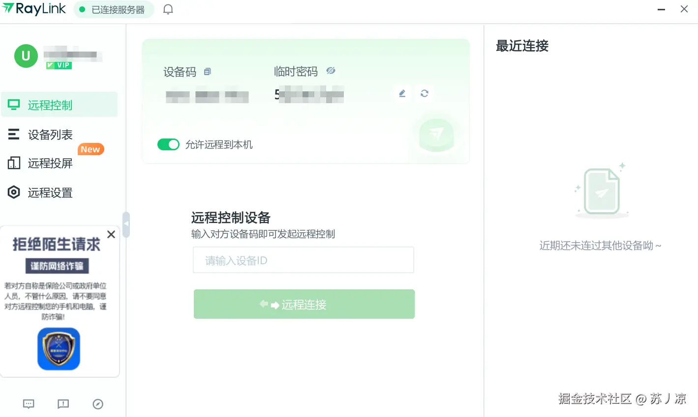 RayLink采用设备码+临时密码的认证模式。每台设备拥有一个9位数字的设备码,同时系统会自动生成8位的临时密码。这个临时密码会定期自动更新,相比固定密码更加安全。用户也可以手动刷新临时密码,或者设置永久的固定密码以方便长期使用。