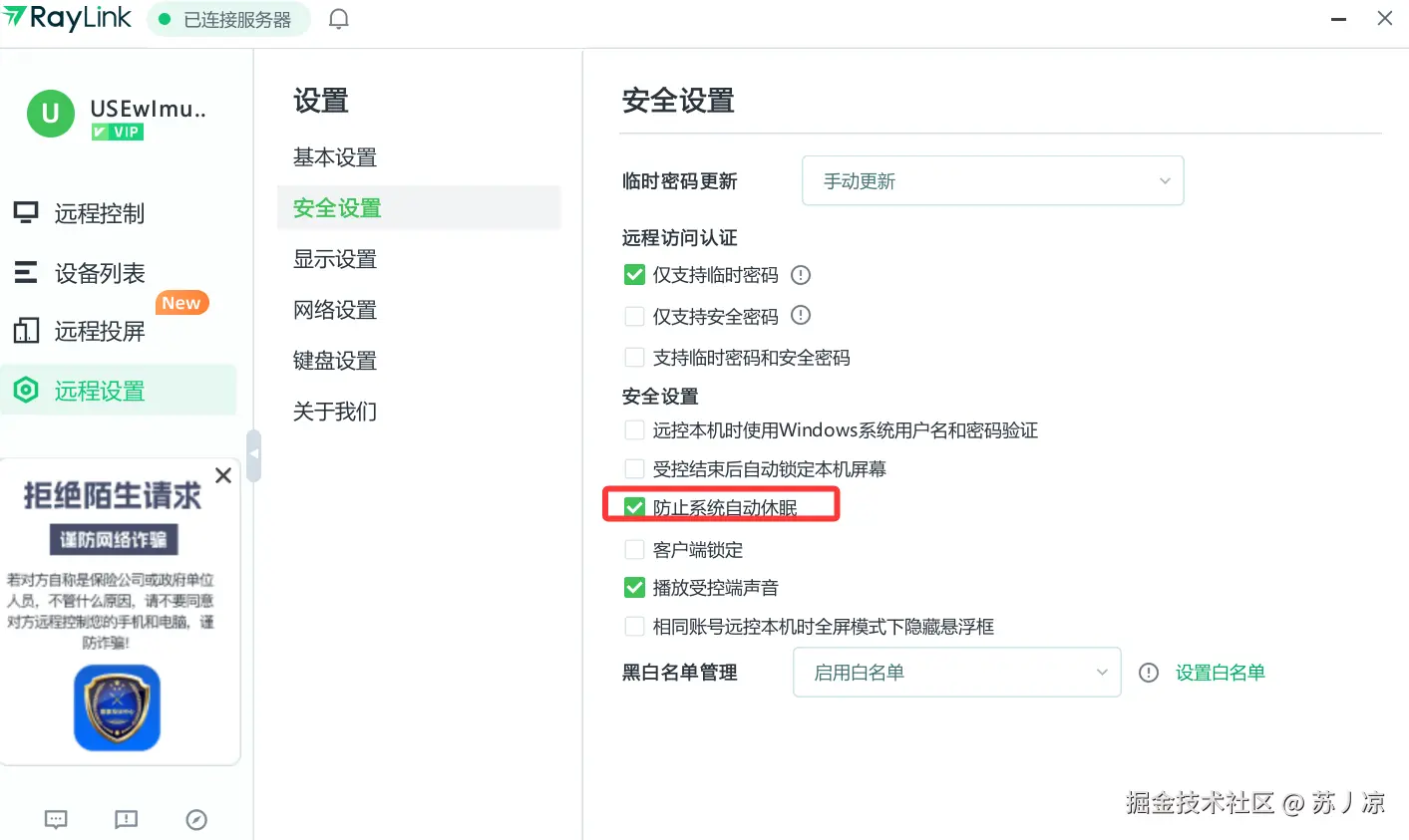 RayLink提供了"防止系统自动休眠"选项,这在某些场景下很实用,但也可能被滥用。如果攻击者获得了访问权限,这个功能会让他们可以长时间保持连接而不被发现。有时候这个也会造成一些安全隐患。