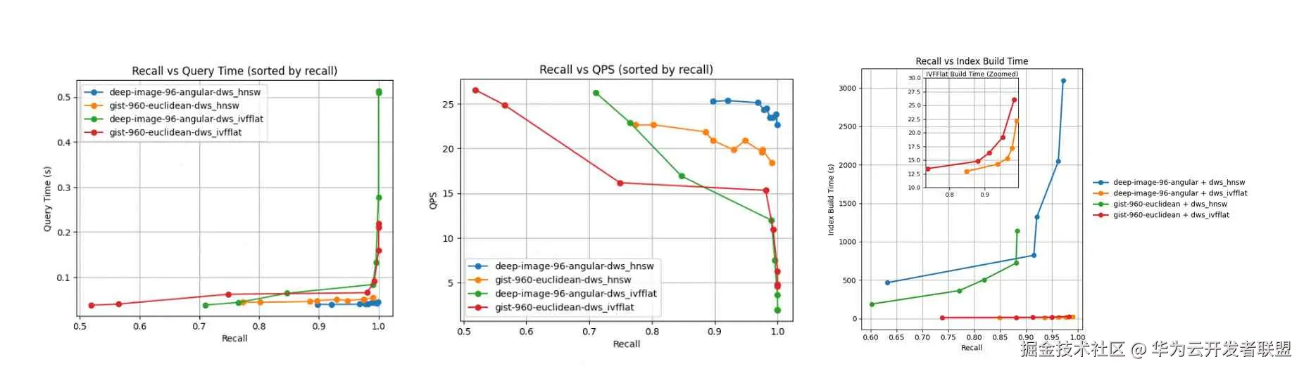 以下图示展示了dws pgvector插件在不同数据集及索引下的检索性能