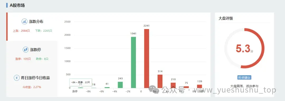 - 全维度涨跌分布:从“跌停-8%”到“8%涨停”分10个区间统计股票数量,一眼看清资金是集中在强势股还是弱势股;