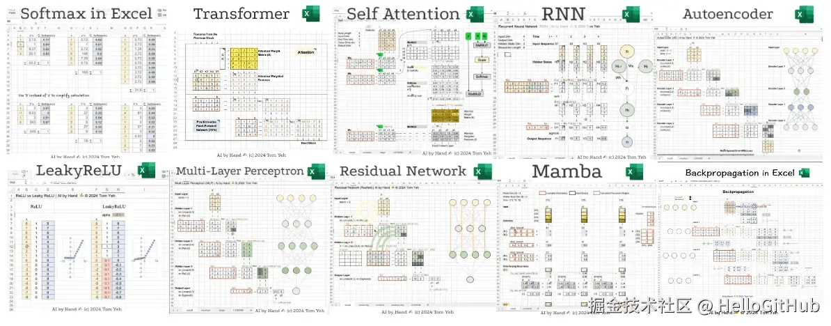 该项目是通过 Excel 的形式实现并演示人工智能与深度学习的核心算法和概念,让初学者可以动手操作并理解 AI 的运行原理,包括矩阵乘法、MLP、RNN、Transformer、ResNet 等,以独特且浅显易懂的形式,降低了 AI 学习的门槛。