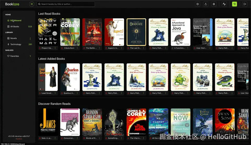 11、booklore:Java 开发的个人数字图书馆。这是一款开源、自托管的电子书管理 Web 应用,支持 PDF 和 ePub 电子书格式。它采用 Java(Spring Boot)+ Angular 开发,支持自动获取书籍信息、分享书籍、阅读进度同步、多用户管理等功能。