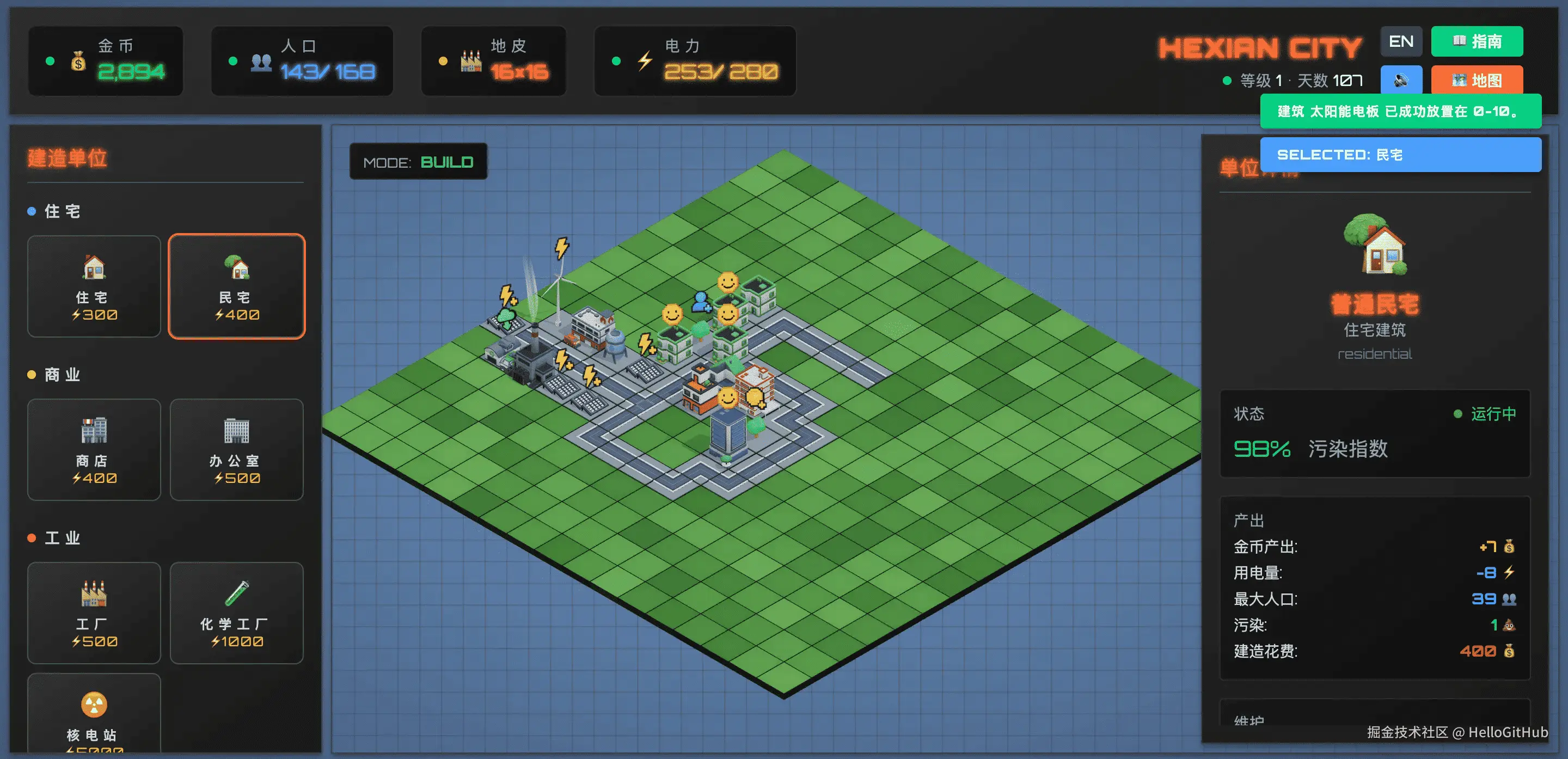 16、CubeCity:卡通风格城市建设模拟游戏。这是一款轻量级、卡通风格的 2.5D 城市模拟游戏,基于 Three.js 和 Vue3 构建。玩家可在浏览器中通过点选和拖放,实时建造、搬迁和拆除建筑。建筑会自动产出金币,可用于新建或升级设施。游戏融合了环境、社会与治理(ESG)理念,城市规划需兼顾多元需求,才能打造出可持续发展的理想城市。