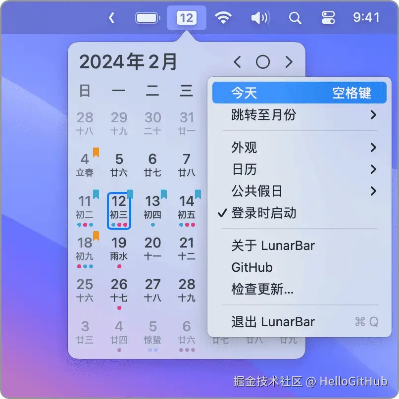 22、LunarBar:极简的 Mac 菜单栏日历。这是一款专为 macOS 设计的菜单栏日历工具,支持农历、节日、节气和提醒等功能。